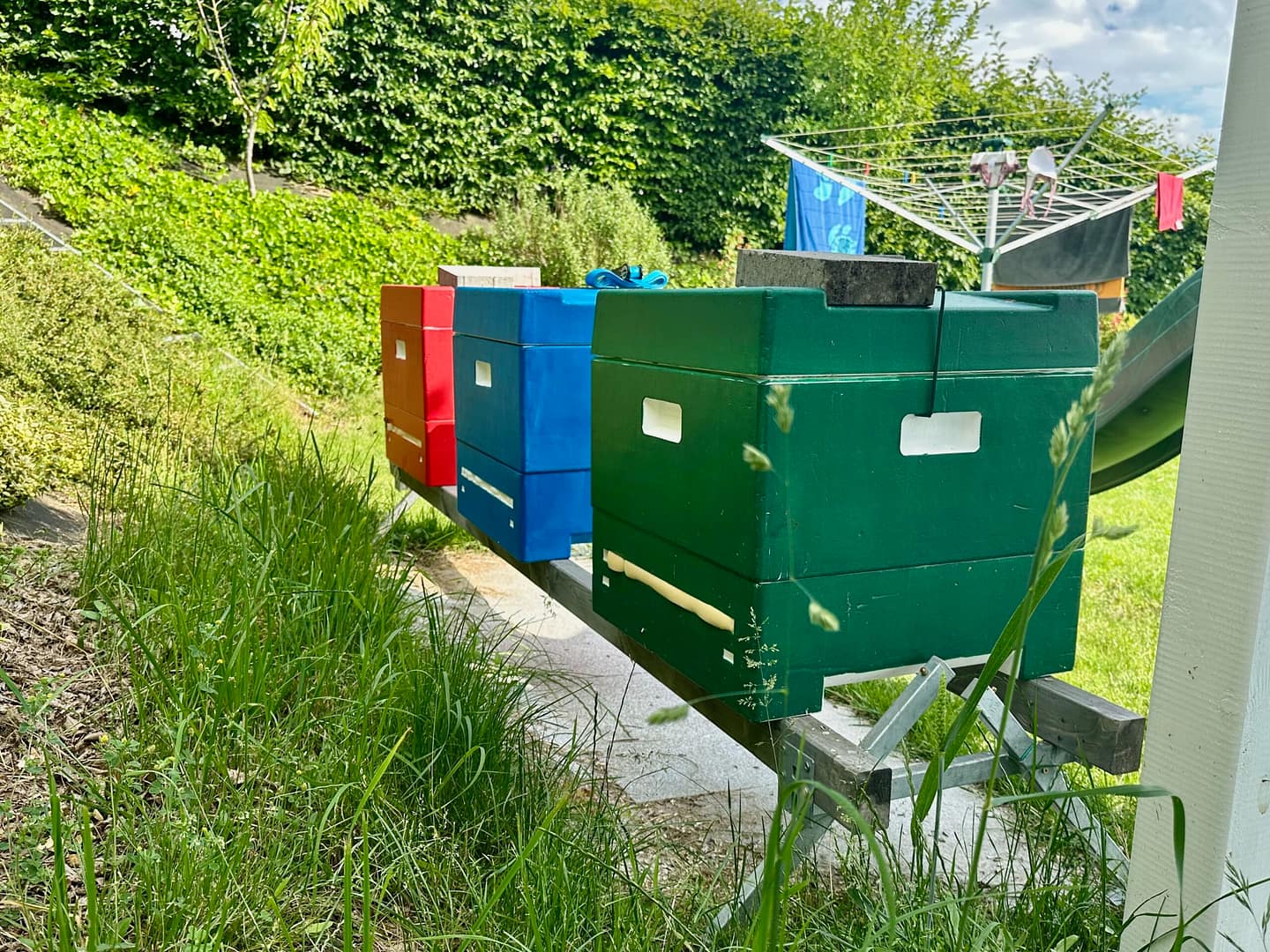 An unserem Bienenstand in Wieshof – der praktischerweise im hauseigenen Garten steht – werden unsere Jungvölker aufgezogen. Sie verbringen Sommer, Herbst und Winter bei uns zu Hause bevor sie im Frühjahr – vor der Erweiterung – an einen unserer Wirtschaftsstände übersiedelt werden.